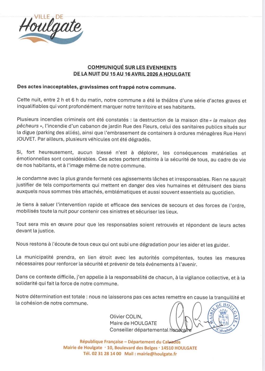 Suite aux événements intervenus cette nuit, nous vous partageons le communiqué du Maire de Houlgate Olivier Colin condamnant ces actes inacceptables.