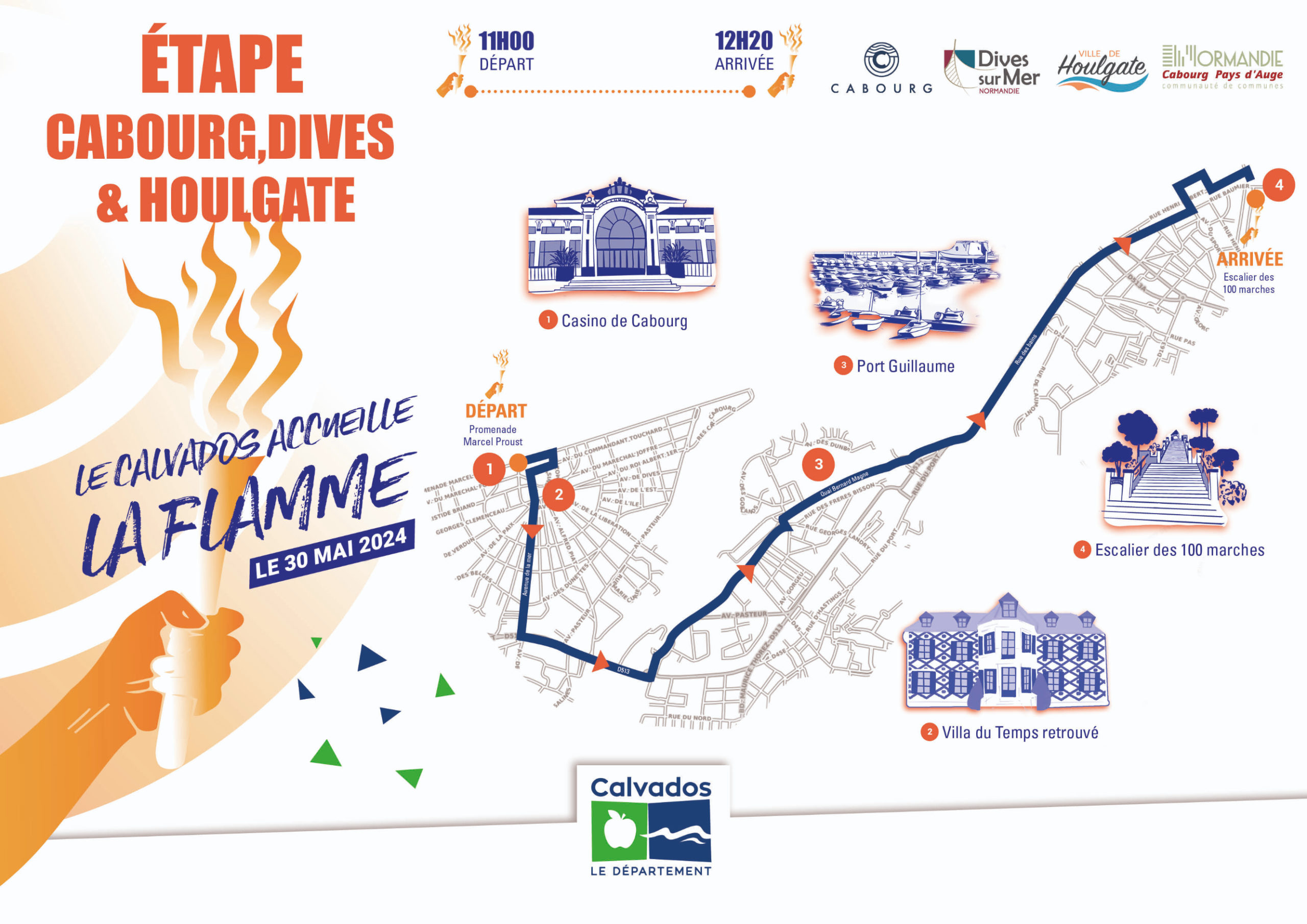 La flamme arrivera par la RD 513 vers 11h45 avant de rejoindre la rue des bains jusqu’au Casino de Houlgate. Pour finir ce parcours Houlgatais, la flamme olympique gravira les mythiques 100 marches. Un lieu fort en histoire pour de nombreux sportifs amateurs et professionnels.